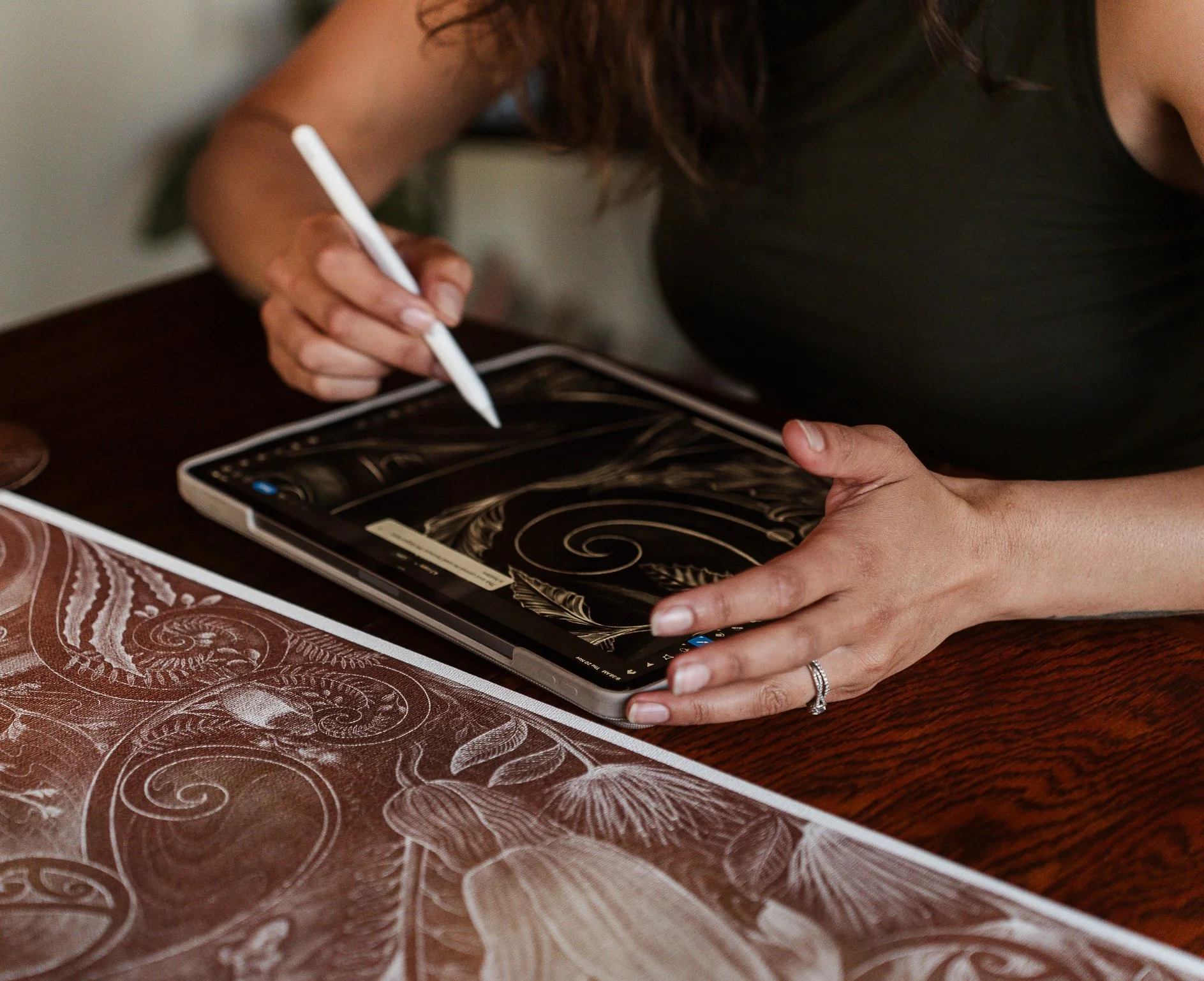 Morgan leads the creative vision of Kahurere, hand-drawing each design and bringing it to life through a distinctly Māori lens. Her work is grounded in whakapapa, narrative and a deep connection to place.